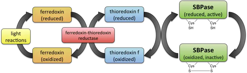 SBPase is involved in the regeneration of 5-carbon sugars during the Calvin cycle. Although SBPase has not been emphasized as an important control point in the Calvin cycle historically, it plays a large part in controlling the flux of carbon through the Calvin cycle.[9] Additionally, SBPase activity has been found to have a strong correlation with the amount of photosynthetic carbon fixation.[10] Like many Calvin cycle enzymes, SBPase is activated in the presence of light through a ferredoxin/thioredoxin system.[11] In the light reactions of photosynthesis, light energy powers the transport of electrons to eventually reduce ferredoxin. The enzyme ferredoxin-thioredoxin reductase uses reduced ferredoxin to reduce thioredoxin from the disulfide form to the dithiol. Finally, the reduced thioredoxin is used to reduced a cysteine-cysteine disulfide bond in SBPase to a dithiol, which converts the SBPase into its active form.[7]