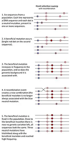 In genetics, a selective sweep is the process through which a new beneficial mutation that increases its frequency and becomes fixed (i.e., reaches a frequency of 1) in the population leads to the reduction or elimination of genetic variation among nucleotide sequences that are near the mutation. In selective sweep, positive selection causes the new mutation to reach fixation so quickly that linked alleles can "hitchhike" and also become fixed.