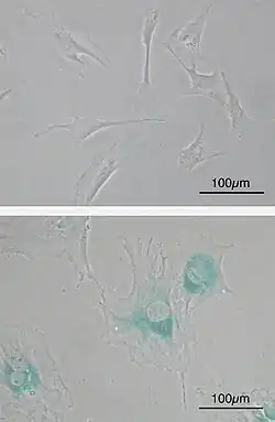 Cellular senescence is a phenomenon characterized by the cessation of cell division.[1][2][3] In their experiments during the early 1960s, Leonard Hayflick and Paul Moorhead found that normal human fetal fibroblasts in culture reach a maximum of approximately 50 cell population doublings before becoming senescent.[4][5][6] This process called the Hayflick limit is also known as "replicative senescence", since it is brought about through replication. Hayflick's discovery of mortal cells paved the path for the discovery and understanding of cellular aging molecular pathways.[7] Cellular senescence can be initiated by a wide variety of stress inducing factors. These stress factors include both environmental and internal damaging events, abnormal cellular growth, oxidative stress, autophagy factors, among many other things.[8]