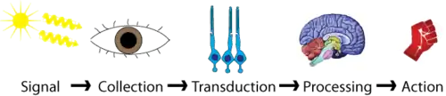A sensory receptor converts the energy in a stimulus into an electrical signal.[1] Receptors are broadly split into two main categories: exteroceptors, which receive external sensory stimuli, and interoceptors, which receive internal sensory stimuli.[2][3]