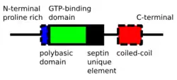 Septins are P-Loop-NTPase proteins that range in weight from 30-65 kDa. Septins are highly conserved between different eukaryotic species. They are composed of a variable-length proline rich N-terminus with a basic phosphoinositide binding motif important for membrane association, a GTP-binding domain, a highly conserved Septin Unique Element domain, and a C-terminal extension including a coiled coil domain of varying length.[4]