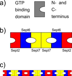 Septins interact either via their respective GTP-binding domains, or via both their N- and C-termini. Different organisms express a different number of septins, and from those symmetric oligomers are formed. For example, in yeast the octameric complex formed is Cdc11-Cdc12-Cdc3-Cdc10-Cdc10-Cdc3-Cdc12-Cdc11.[8] In humans, hexameric or octameric complexes are possible. Initially, it was indicated that the human complex was Sept7-Sept6-Sept2-Sept2-Sept6-Sept7;[9] but recently this order has been revised to Sept2-Sept6-Sept7-Sept7-Sept6-Sept2[10] (or Sept2-Sept6-Sept7-Sept3-Sept3-Sept7-Sept6-Sept2[11] in case of octameric hetero-oligomers). These complexes then associate to form non-polar filaments, filament bundles, cages or ring structures in cells.[4]