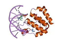 The C-terminal protein domain has an important role in binding to DNA. It binds to fully methylated and hemimethylated GATC sequences at oriC. The structure of the C-terminal domain consists of seven alpha-helices and a three-stranded beta-sheet.[5]