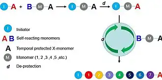 Other than biological polymerization methods, scientists have also developed numerous chemical synthetic methods for sequence-controlled polymers. Compared with biological polymerization, chemical polymerization can provide better diversity but most of the chemical methods cannot offer the efficiency and specificity of biological methods.[1]