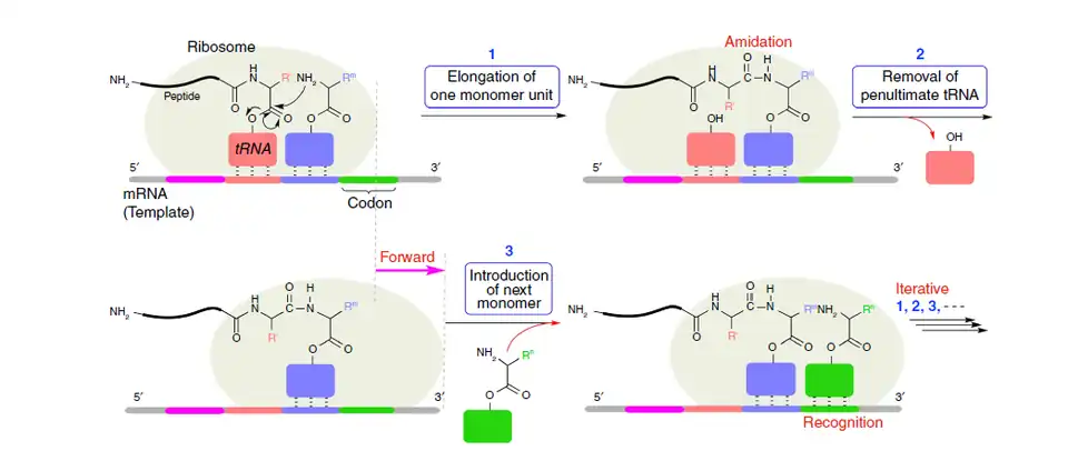 DNA, RNA and proteins are most common sequence-controlled polymers in living creatures. Inspired by them, polymerization methods, utilizing DNA or RNA as templates to control sequences of polymer, are developed. At first, taking DNA or RNA as templates, scientists developed a series of peptide nucleic acid (PNA)-based polymers, without using DNA polymerases.[6][7] But this method is limited to polymerization scale and yield.[1] After that, polymerase chain reaction (PCR) is developed, which currently is still the most extensively used sequence-regulated method.[8] By employing enzymes, the yields and scales are greatly increased, but the specificity of enzymes towards natural peptides limits this technique to a certain degree. Nowadays, more attention is paid to utilization of ribosomes to directly mimic the transcription and translation process.[9] This technology called protein engineering is considered as the most promising biological polymerization method for synthesis of sequence-controlled polymers.