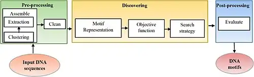 Motif discovery happens in three major phases. A pre-processing stage where sequences are meticulously prepared in assembly and cleaning steps. Assembly involves selecting sequences that contain the desired motif in large quantities, and extraction of unwanted sequences using clustering. Cleaning then ensures the removal of any confounding elements. Next there is the discovery stage. In this phase sequences are represented using consensus strings or Position-specific Weight Matrices (PWM). After motif representation, an objective function is chosen and a suitable search algorithm is applied to uncover the motifs. Finally the post-processing stage involves evaluating the discovered motifs.[2]