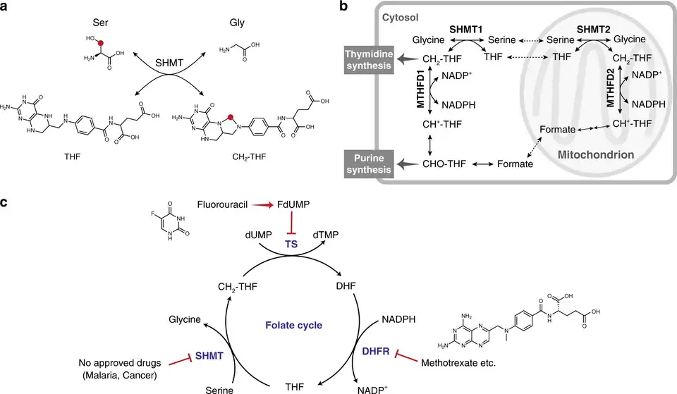 - ↑ Pinthong C, Maenpuen S, Amornwatcharapong W, Yuthavong Y, Leartsakulpanich U, Chaiyen P (June 2014). "Distinct biochemical properties of human serine hydroxymethyltransferase compared with the Plasmodium enzyme: implications for selective inhibition". The FEBS Journal. 281 (11): 2570–2583. doi:10.1111/febs.12803. PMID 24698160.