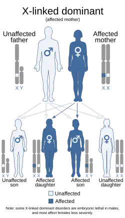 X-linked dominant inheritance is the pattern by which a trait encoded by an allele on the X-chromosome is passed down through generations, wherefore only one copy of that allele is sufficient for an individual to be affected (dominance).[11] Unlike with X-linked recessive traits, females are more often affected by X-linked dominant traits than males as females have two X-chromosomes as opposed to one. Moreover, some X-linked dominant conditions (for example, Aicardi syndrome) are embryonically or neonatally lethal in hemizygous males (XY), and thus can be seen to only affect heterozygous females, who experience less severe symptoms.[12]