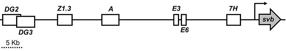 Developmental enhancers are DNA sequences which control the spatial-temporal patterning of genes during development to set up the bodyplan of an organism.[13] Developmental enhancers are thought to be the main drivers of phenotypic evolution.[6][9] There are currently seven putative developmental enhancers in the shavenbaby locus: DG2, DG3, Z1.3, A, E3, E6, and 7H.[14][15] All of these enhancers are pleiotropic, expressing shavenbaby across different developmental stages.[15] The enhancers are somewhat modular, where different patterning components are partitioned to different enhancers. However, many of the expression patterns overlap with each other making the enhancers seemingly redundant.[7]