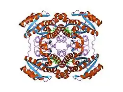 The short-chain dehydrogenases/reductases family (SDR)[2] is a very large family of enzymes, most of which are known to be NAD- or NADP-dependent oxidoreductases. As the first member of this family to be characterised was Drosophila alcohol dehydrogenase, this family used to be called[3][4][5] 'insect-type', or 'short-chain' alcohol dehydrogenases. Most members of this family are proteins of about 250 to 300 amino acid residues. Most dehydrogenases possess at least 2 domains,[6] the first binding the coenzyme, often NAD, and the second binding the substrate. This latter domain determines the substrate specificity and contains amino acids involved in catalysis. Little sequence similarity has been found in the coenzyme binding domain although there is a large degree of structural similarity, and it has therefore been suggested that the structure of dehydrogenases has arisen through gene fusion of a common ancestral coenzyme nucleotide sequence with various substrate specific domains.[6]