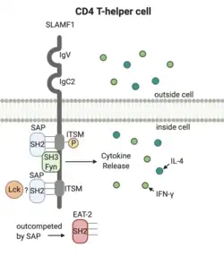 Signaling lymphocytic activation molecules are a CD2-related surface receptor expressed by activated phagocytes, T helper cells, and platelets.[3] SLAMs have a variety of functions, including enhancing T cellular proliferation by stimulating IL-4 and IFN-gamma production.[4] SLAM family (SLAMF) receptors can interact directly with microbes, which can cause phagocytic cells to migrate to the area.[5] SLAMF activation can trigger SLAM-associated protein (SAP) activation and a defective SAP can cause X-linked lymphoproliferative syndrome (XLP).[4]