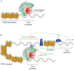 Silencers in eukaryotes control gene expression on a transcriptional level in which the mRNA is not transcribed. These DNA sequences may act as either silencers or enhancers based on the transcription factor that binds to the sequence and binding of this sequence will prevent promoters such as the TATA box from binding to RNA polymerase.[7] A repressor protein may have regions that bind to the DNA sequence as well as regions that bind to the transcription factors assembled at the promoter of the gene which would create a chromosome looping mechanism.[9] Looping brings silencers in close proximity to the promoters to ensure that groups of proteins needed for optimal gene expression will work together.