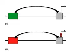 Another regulatory element located upstream of the gene is an enhancer. Enhancers function as a "turn on" switch in gene expression and will activate the promoter region of a particular gene while silencers act as the "turn off" switch. Though these two regulatory elements work against each other, both sequence types affect the promoter region in very similar ways.[4] Because silencers have not been thoroughly identified and analyzed, the extensive research on enhancers has aided biologists in understanding the mechanics of the silencer. Enhancers can be found in many of the same areas that silencers are found, such as upstream of the promoter by many kilobase pairs, or even downstream within the intron of the gene.[4] DNA looping is also a model function used by enhancers in order to shorten the proximity of the promoter to the enhancer. Enhancers also function with transcription factors in order to initiate expression, much like silencers can with repressors.[4]