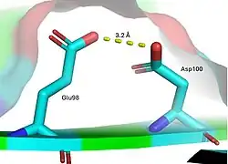 In the fibroin β-sheet there are specific residues that are preserved in the N-terminal domain in order to prevent premature sheet formation at a neutral pH. Glu98 and Asp100 are both acidic, meaning they have negative charges when at a neutral pH. Since they have the same charge, the residues will create electrostatic repulsion which can cause the side chains to repel each other. At a low pH however, these residues would become protonated and lose their charge. When the charge repulsion is not present, hydrogen bonding and hydrophobic interactions become the main driving force of β-sheet formation. Therefore, when at a neutral pH Glu98 and Asp100 are deprotonated, and the electrostatic repulsion occurs. This repulsion reduces structural stability or can even prevent premature formation of the β-sheet. This is just one example of this interaction. This repulsion occurs between various other amino acids that the β-sheet is composed of. By preventing the premature formation, the electrostatic repulsions help ensure that the β-sheet is formed correctly which will allow for fibroin to function properly. The regulation of the β-sheet formation is especially important to the integrity of silk since fibroin is one of the primary structural proteins in silk.[6]
