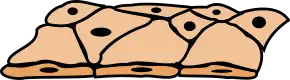 A simple squamous epithelium, also known as pavement epithelium and tessellated epithelium, is a single layer of flattened, polygonal cells in contact with the basal lamina (one of the two layers of the basement membrane) of the epithelium.[1] This type of epithelium is often permeable and occurs where small molecules need to pass quickly through membranes via filtration or diffusion. Simple squamous epithelia are found in endothelium (lining of blood and lymph capillaries), mesothelium (coelomic epithelium/peritoneum), alveoli of lungs, glomeruli, and other tissues where rapid diffusion is required.[2] Within the cardiovascular system such as lining capillaries or the inside of the heart, simple squamous epithelium is specifically called the endothelium.[3] Cells are flat with flattened and oblong nuclei. It is also called pavement epithelium due to its tile-like appearance. This epithelium is associated with filtration and diffusion. This tissue is extremely thin and forms a delicate lining. It offers very little protection.
