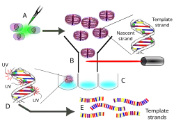 Cells of interest are cultured either in vivo or in vitro. During S-phase cells are treated with bromodeoxyuridine (BrdU) which is then incorporated into their nascent DNA, acting as a substitute for thymidine. After at least one replication event has occurred, the daughter cells are synchronized at the G2 phase and individually separated by fluorescence-activated cell sorting (FACS). The cells are directly sorted into lysis buffer and their DNA is extracted. Having been arrested at a specified number of generations (usually one), the inheritance patterns of sister chromatids can be assessed. The following methods concentrate on the DNA sequencing of a single daughter cell's DNA. At this point the chromosomes are composed of nascent strands with BrdU in place of thymidine and the original template strands are primed for DNA sequencing library preparation. Since this protocol was published in 2012,[1] the canonical methodology is only well described for Illumina sequencing platforms; the protocol could very easily be adapted for other sequencing platforms, depending on the application. Next, the DNA is incubated with a special dye such that when the BrdU-dye complex is excited by UV light, nascent strands are nicked by photolysis. This process inhibits polymerase chain reaction (PCR) amplification of the nascent strand, allowing only the parental template strands to be amplified. Library construction proceeds as normal for Illumina paired-end sequencing. Multiplexing PCR primers are then ligated to the PCR amplicons with hexamer barcodes identifying which cell each fragment they are derived from. Unlike single cell sequencing protocols, Strand-seq does not utilize multiple displacement amplification or MALBAC for DNA amplification. Rather, it is solely dependent on PCR.