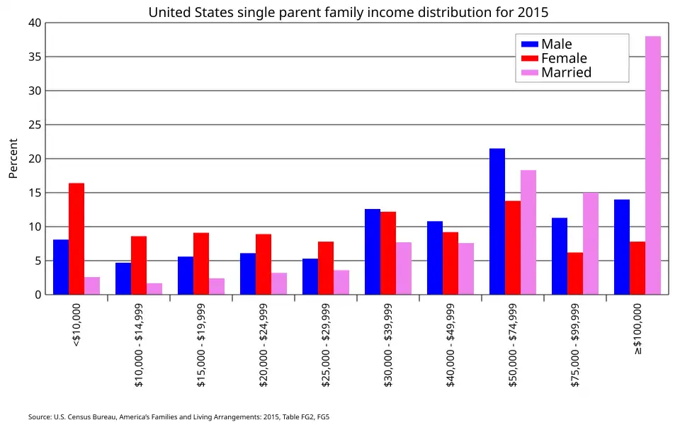 Over 9.5 million American families are run by one woman. Single mothers are likely to have mental health issues, financial hardships, live in a low income area, and receive low levels of social support. All of these factors are taken into consideration when evaluating the mental health of single mothers. The occurrence of moderate to severe mental disability was more pronounced among single mothers at 28.7% compared to partnered mothers at 15.7%.[15] These mental disabilities include but are not limited to anxiety and depression. Financial hardships also affect the mental health of single mothers. Women, ages 15–24, were more likely to live in a low socio-economic area, have one child, and not to have completed their senior year of high school. These women reported to be in the two lowest income areas, and their mental health was much poorer than those in higher income areas.[15]