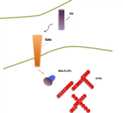 Guidance molecules act as cues by carrying information to receptive cells; administering this information which tells the cell and its entities how to properly align.[10] Slit proteins behave as such when working in axonal guidance during the development of the nervous system. Similarly, these proteins help to orchestrate the development of various networks of tissues throughout the body. This role, also described as cell migration, is the primary role of Slit when interacting with Robo. It is most commonly found acting in neurons, endothelial cells and cancer cells.[10]
