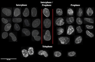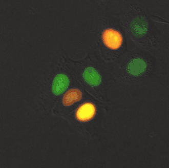 Fluorescently imaging the cell cycle. Pioneering work by Atsushi Miyawaki and coworkers developed the fluorescent ubiquitination-based cell cycle indicator (FUCCI), which enables fluorescence imaging of the cell cycle. Originally, a green fluorescent protein, mAG, was fused to hGem(1/110) and an orange fluorescent protein (mKO2) was fused to hCdt1(30/120). Note, these fusions are fragments that contain a nuclear localization signal and ubiquitination sites for degradation, but are not functional proteins. The green fluorescent protein is made during the S, G2, or M phase and degraded during the G0 or G1 phase, while the orange fluorescent protein is made during the G0 or G1 phase and destroyed during the S, G2, or M phase.[25] A far-red and near-infrared FUCCI was developed using a cyanobacteria-derived fluorescent protein (smURFP) and a bacteriophytochrome-derived fluorescent protein (movie found at this link).[1]