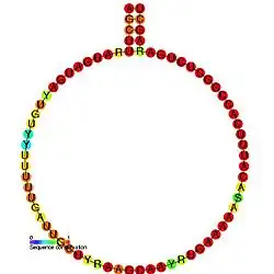 U102 was identified by computational screening of the introns of ribosomal protein genes for conserved C/D box sequence motifs and expression experimentally verified by northern blotting.[2] It is found within intron 2 of the L21 ribosomal protein gene. The H/ACA box snoRNA ACA27 is found in the same host gene within a different intron.[3]