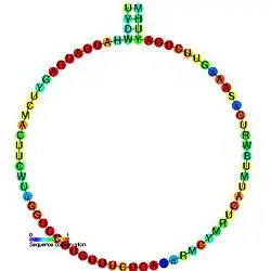 In humans and Xenopus laevis there are three closely related copies of U18 (called U18A, U18B, U18C) which are encoded in introns of ribosomal protein L1.[2] In yeast U18 is located in the introns of Elongation Factor 1 beta (EF1-beta). Related snoRNAs in Arabidopsis thaliana and rice Oryza sativa have been named R63 and Z106 respectively. Factors involved in the processing of the intronic snoRNA have recently been elucidated.[3]