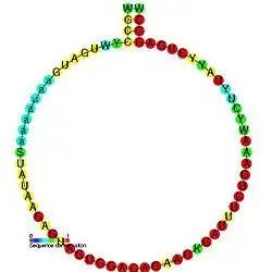 U75 (SNORD75) belongs to the C/D box class of snoRNAs which contain the C (UGAUGA) and D (CUGA) box motifs. Most of the members of the box C/D family function in directing site-specific 2′-O-methylation of substrate RNAs.[1] The mouse snoRNA Z19 is orthologous to human U75. U75 is predicted to guide the 2′-O-ribose methylation of 28S ribosomal RNA (rRNA) residue C4032.[2] In humans U75 shares the same non-protein coding host gene (gas5) with 9 other snoRNAs (U44, U47, U74, U76, U77, U78, U79, U80 and U81).[3]