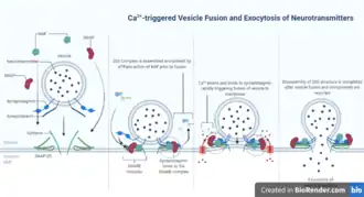 - 1 2 Rizo J (August 2018). "Mechanism of neurotransmitter release coming into focus". Protein Science. 27 (8): 1364–1391. doi:10.1002/pro.3445. PMC 6153415. PMID 29893445.