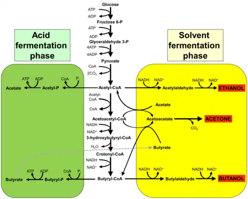 Solventogenic Clostridium species have a biphasic metabolism composed of an acidogenic phase and a solventogenic phase. During acidogenesis, these bacteria are able to convert several carbon sources into organic acids, commonly butyrate and acetate.[2] As acid accumulates, cells begin to assimilate the organic acids into solvents. In Clostridium acetobutylicum, a model solventogenic Clostridium species, a combination of low pH and high undisociated butyrate, referred to as the "pH-acid effect", triggers the metabolic shift from acidogenesis to solventogenesis.[3]