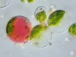 Fused protoplast (left) with chloroplasts (from a leaf cell) and coloured vacuole (from a petal)