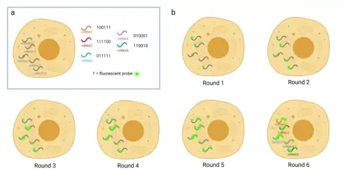 Sequential fluorescence in situ hybridization (seqFISH) is another method that provides identification of mRNA directly in single cells with preservation of their spatial context.[45][46] This method is carried out in multiple rounds; each of them includes fluorescent probe hybridization, imaging, and consecutive probe stripping.[45] Various genes are assigned different colors in every round, generating a unique temporal barcode.[45] Thus, seqFISH distinguishes mRNAs by a sequential color code, such as red-red-green. Nevertheless, this technique has its flaws featuring autofluorescent background and high costs due to the number of probes used in each round.[4]