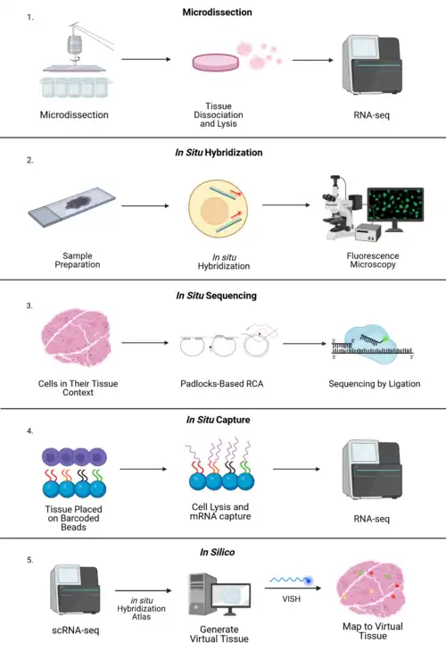 Spatial transcriptomics includes methods that can be divided into two modalities, those based in next-generation sequencing for gene detection, and those based in imaging.[3] Some common approaches to resolve spatial distribution of transcripts are microdissection techniques, fluorescent in situ hybridization methods, in situ sequencing, in situ capture protocols and in silico approaches.[4]