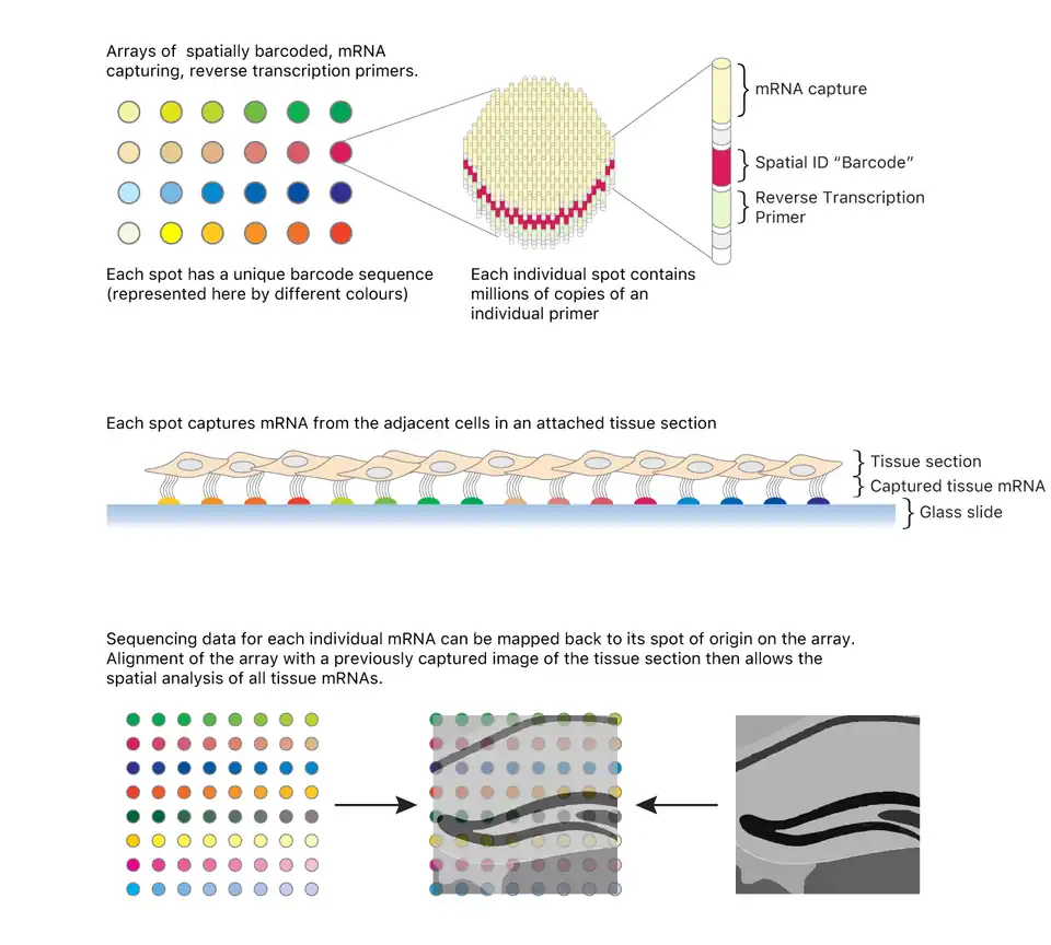 The first widely-adopted method was described by Ståhl et al. in a landmark 2016 paper in Science,[64] coining the term "spatial transcriptomics." This methodology relies on diffusion of mRNA from a fresh frozen tissue section for capture of the polyadenylated mRNAs via hybridization to oligo(dT) sequence attached to a glass slide.[64] The glass slide is arrayed with "spots" that contain oligo(dT) sequence to capture mRNA transcripts, spatial barcode sequence to indicate the x and y position on the arrayed slide, amplification and sequencing handle to generate sequence libraries, and unique molecular identifier to quantitate transcript abundance.[64] Frozen tissue samples are cut using cryotome, then fixed, stained, and carefully laid flat onto the microarray.[64] Next, enzymatic permeabilization allows RNA molecules to diffuse to the microarray slide for hybridization of polyadenylated mRNA molecules to the oligo(dT) sequence tails.[64] Reverse transcription is then carried out in situ for first-strand synthesis.[64] As a result, spatially marked complementary DNA (cDNA) is synthesized, providing information about gene expression in the exact location of the tissue section.[64] From the cDNA, libraries are generated for short-read sequencing. In summary, this spatial transcriptomics protocol combines paralleled sequencing and staining of the same sample.[64] In the downstream analysis, bioinformatic tools allow overlay of the tissue image with the gene expression. The output is a map of the transcriptome captured gene expression within a tissue section. It is important to mention that the first generation of the arrayed slides comprised about 1,000 spots of the 100-μm diameter, limiting resolution to ~10-40 cells per spot.[64]