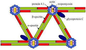 Spectrin is a cytoskeletal protein that lines the intracellular side of the plasma membrane in eukaryotic cells. Spectrin forms pentagonal or hexagonal arrangements, forming a scaffold and playing an important role in maintenance of plasma membrane integrity and cytoskeletal structure.[1] The hexagonal arrangements are formed by tetramers of spectrin subunits associating with short actin filaments at either end of the tetramer. These short actin filaments act as junctional complexes allowing the formation of the hexagonal mesh. The protein is named spectrin since it was first isolated as a major protein component of human red blood cells which had been treated with mild detergents; the detergents lysed the cells and the hemoglobin and other cytoplasmic components were washed out. In the light microscope the basic shape of the red blood cell could still be seen as the spectrin-containing submembranous cytoskeleton preserved the shape of the cell in outline. This became known as a red blood cell "ghost" (spectre), and so the major protein of the ghost was named spectrin.