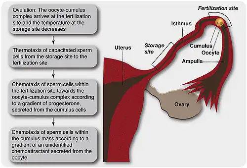 Like in any other highly essential system in biology, mammalian sperm guidance is expected to involve redundancy. Indeed, at least three guidance mechanisms are likely to act in the female genital tract, two active mechanisms — chemotaxis and thermotaxis, and a passive mechanism — rheotaxis. When one of these mechanisms is not functional for any reason, guidance is not expected to be lost and the cells should still be able to navigate to the oocyte. This resembles guidance of migrating birds, where the birds' navigation is unaffected when one of the guidance mechanisms is not functional.[68] It has been suggested that capacitated spermatozoa, released from the sperm storage site at the isthmus,[69] may be first actively guided by thermotaxis from the cooler sperm storage site towards the warmer fertilization site[9] (Figure 2). Two passive processes, rheotaxis[10] and contractions of the oviduct[70] may assist the spermatozoa to reach there. At this location, the spermatozoa may be chemotactically guided to the oocyte-cumulus complex by the gradient of progesterone, secreted from the cumulus cells.[46][47][48] In addition, progesterone may inwardly guide spermatozoa, already present within the periphery of the cumulus oophorus.[46] Spermatozoa that are already deep within the cumulus oophorus may sense the more potent chemoattractant that is secreted from the oocyte[36][49] and chemotactically guide themselves to the oocyte according to the gradient of this chemoattractant. It should be borne in mind, however, that this is only a model.