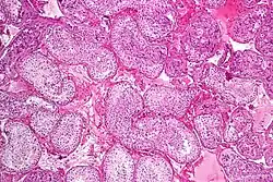![]() Seminiferous tubule with maturing sperm. H&E stain. | |
