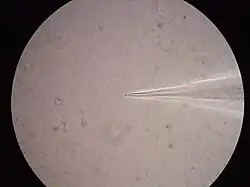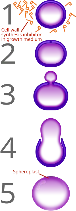 A spheroplast (or sphaeroplast in British usage) is a microbial cell from which the cell wall has been almost completely removed, as by the action of penicillin or lysozyme. According to some definitions, the term is used to describe Gram-negative bacteria.[3][4] According to other definitions, the term also encompasses yeasts.[5][6] The name spheroplast stems from the fact that after the microbe's cell wall is digested, membrane tension causes the cell to acquire a characteristic spherical shape.[4] Spheroplasts are osmotically fragile, and will lyse if transferred to a hypotonic solution.[5]
