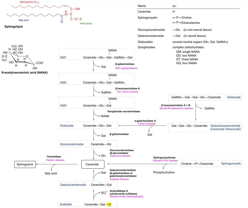 Sphingolipidoses are a class of lipid storage disorders or degenerative storage disorders caused by deficiency of an enzyme that is required for the catabolism of lipids that contain ceramide,[1] also relating to sphingolipid metabolism. The main members of this group are Niemann–Pick disease, Fabry disease, Krabbe disease, Gaucher disease, Tay–Sachs disease and metachromatic leukodystrophy. They are generally inherited in an autosomal recessive fashion, but notably Fabry disease is X-linked recessive. Taken together, sphingolipidoses have an incidence of approximately 1 in 10,000, but substantially more in certain populations such as Ashkenazi Jews. Enzyme replacement therapy is available to treat mainly Fabry disease and Gaucher disease, and people with these types of sphingolipidoses may live well into adulthood. The other types are generally fatal by age 1 to 5 years for infantile forms, but progression may be mild for juvenile- or adult-onset forms.