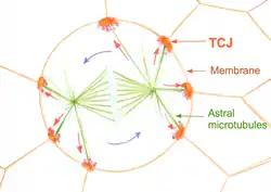 Cell division orientation is of major importance for tissue architecture, cell fates and morphogenesis. Cells tend to divide along their long axis according to the so-called Hertwig rule. The axis of cell division is determined by the orientation of the spindle apparatus. Cells divide along the line connecting two centrosomes of the spindle apparatus. After formation, the spindle apparatus undergoes rotation inside the cell. The astral microtubules originating from centrosomes reach the cell membrane where they are pulled towards specific cortical clues. In vitro, the distribution of cortical clues is set up by the adhesive pattern.[38] In vivo polarity cues are determined by localization of Tricellular junctions localized at cell vertices.[39] The spatial distribution of cortical clues leads to the force field that determine final spindle apparatus orientation and the subsequent orientation of cell division.