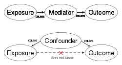 The term "spurious relationship" is commonly used in statistics and in particular in experimental research techniques, both of which attempt to understand and predict direct causal relationships (X → Y). A non-causal correlation can be spuriously created by an antecedent which causes both (W → X and W → Y). Mediating variables, (X → M → Y), if undetected, estimate a total effect rather than direct effect without adjustment for the mediating variable M. Because of this, experimentally identified correlations do not represent causal relationships unless spurious relationships can be ruled out.