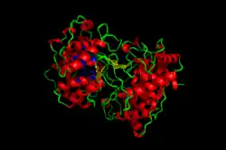 ![]() The crystallographic structure of the squalene-hopene cyclase dimer, with the membrane position indicated in blue, the two monomers in green and pink, and a substrate mimetic in the central cavity in yellow.[1] | |||||||||