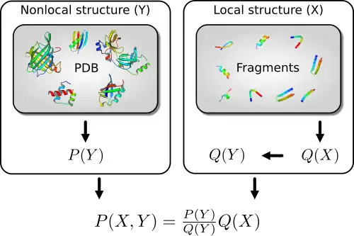 Expressions that resemble statistical PMFs naturally result from the application of probability theory to solve a fundamental problem that arises in protein structure prediction: how to improve an imperfect probability distribution over a first variable using a probability distribution over a second variable , with .[6] Typically, and are fine and coarse grained variables, respectively. For example, could concern the local structure of the protein, while could concern the pairwise distances between the amino acids. In that case, could for example be a vector of dihedral angles that specifies all atom positions (assuming ideal bond lengths and angles). In order to combine the two distributions, such that the local structure will be distributed according to , while the pairwise distances will be distributed according to , the following expression is needed: