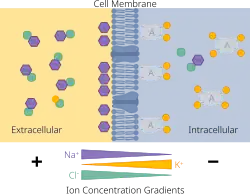 One main function of plasma and cell membranes is to maintain asymmetric concentrations of inorganic ions in order to maintain an ionic steady state different from electrochemical equilibrium.[8] In other words, there is a differential distribution of ions on either side of the cell membrane - that is, the amount of ions on either side is not equal and therefore a charge separation exists.[8] However, ions move across the cell membrane such that a constant resting membrane potential is achieved; this is ionic steady state.[8] In the pump-leak model of cellular ion homeostasis, energy is utilized to actively transport ions against their electrochemical gradient.[9] The maintenance of this steady state gradient, in turn, is used to do electrical and chemical work, when it is dissipated though the passive movement of ions across the membrane.[9]