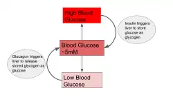 Blood glucose levels are maintained at a steady state concentration by balancing the rate of entry of glucose into the blood stream (i.e. by ingestion or released from cells) and the rate of glucose uptake by body tissues.[1] Changes in the rate of input will be met with a change in consumption, and vice versa, so that blood glucose concentration is held at about 5 mM in humans.[1] A change in blood glucose levels triggers the release of insulin or glucagon, which stimulates the liver to release glucose into the bloodstream or take up glucose from the bloodstream in order to return glucose levels to steady state.[1] Pancreatic beta cells, for example, increase oxidative metabolism as a result of a rise in blood glucose concentration, triggering secretion of insulin.[3] Glucose levels in the brain are also maintained at steady state, and glucose delivery to the brain relies on the balance between the flux of the blood brain barrier and uptake by brain cells.[4] In teleosts, a drop of blood glucose levels below that of steady state decreases the intracellular-extracellular gradient in the bloodstream, limiting glucose metabolism in red blood cells.[5]