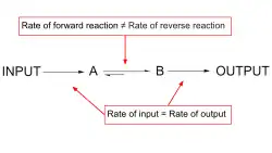 Metabolic regulation achieves a balance between the rate of input of a substrate and the rate that it is degraded or converted, and thus maintains steady state.[1] The rate of metabolic flow, or flux, is variable and subject to metabolic demands.[1] However, in a metabolic pathway, steady state is maintained by balancing the rate of substrate provided by a previous step and the rate that the substrate is converted into product, keeping substrate concentration relatively constant.[1]