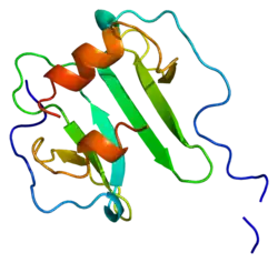 The stromal cell-derived factor 1 (SDF-1), also known as C-X-C motif chemokine 12 (CXCL12), is a chemokine protein that in humans is encoded by the CXCL12 gene on chromosome 10.[5] It is ubiquitously expressed in many tissues and cell types.[6] Stromal cell-derived factors 1-alpha and 1-beta are small cytokines that belong to the chemokine family, members of which activate leukocytes and are often induced by proinflammatory stimuli such as lipopolysaccharide, TNF, or IL1. The chemokines are characterized by the presence of 4 conserved cysteines that form 2 disulfide bonds. They can be classified into 2 subfamilies. In the CC subfamily, the cysteine residues are adjacent to each other. In the CXC subfamily, they are separated by an intervening amino acid. The SDF1 proteins belong to the latter group.[5] CXCL12 signaling has been observed in several cancers.[7][8] The CXCL12 gene also contains one of 27 SNPs associated with increased risk of coronary artery disease.[9]