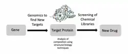 Structural biology is also an important component of drug discovery.[24] Scientists can identify targets using genomics, study those targets using structural biology, and develop drugs that are suited for those targets. Specifically, ligand-NMR, mass spectrometry, and X-ray crystallography are commonly used techniques in the drug discovery process. For example, researchers have used structural biology to better understand Met, a protein encoded by a protooncogene that is an important drug target in cancer.[25] Similar research has been conducted for HIV targets to treat people with AIDS.[24] Researchers are also developing new antimicrobials for mycobacterial infections using structure-driven drug discovery.[24]