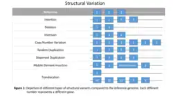 Structural variation is an important type of human genetic variation that contributes to phenotypic diversity.[2] There are microscopic and submicroscopic structural variants which include deletions, duplications, and large copy number variants as well as insertions, inversions, and translocations.[1] These are several different types of structural variants in the human genome and they are quite distinctive from each other. A translocation is a chromosomal rearrangement, at the inter- or intra-chromosomal level, where a section of a chromosome changes position but with no change in the whole DNA content.[1] A section of DNA that is larger than 1 kb and occurs in two or more copies per haploid genome, in which the different copies share greater than 90% of the same sequence, are considered to be segmental duplications or low-copy repeats.[1] These are only a few of the several different types of structural variants that have been known to exist in the human genome. A table visualizing these different forms of structural variants, as well as others, is shown in Figure 1.
