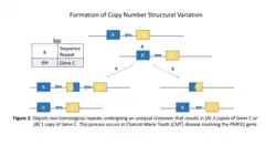 There are several structural variants in the human genome that have been observed but have not led to any obvious phenotypic effects.[1] There are some, however, that play a role in gene dosage which could lead to genetic diseases or distinct phenotypes. Structural variants can directly affect gene expression, such as with copy-number variants, or indirectly through position effects.[1] These effects can have significant implications in susceptibility to disease. The first gene dosage effect that was observed, and considered to be an autosomal dominant disease from an inherited DNA rearrangement, was Charcot-Marie Tooth (CMT) disease. Most of the associations found with CMT were with a 1.5 Mb tandem duplication in 17p11.2-p12 at the PMP22 gene.[11] The proposed mechanism for the structural variation is shown in Figure 2. When an individual has three copies of the normal gene, it results in the disease phenotype.[11] If the individual had only one copy of the PMP22 gene, on the other hand, the result was a clinically different hereditary neuropathy with liability to pressure palsies.[11] The differences in gene dosage created vastly different disease phenotypes which revealed the significant role that structural variation has on phenotype and susceptibility to disease.