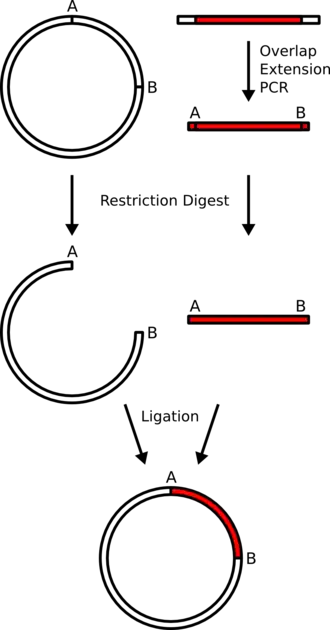 In this example, a gene from mammalian gene library will be subcloned into a bacterial plasmid (destination platform). The bacterial plasmid is a piece of circular DNA which contains regulatory elements allowing for the bacteria to produce a gene product (gene expression) if it is placed in the correct place in the plasmid. The production site is flanked by two restriction enzyme cutting sites "A" and "B" with incompatible sticky ends.