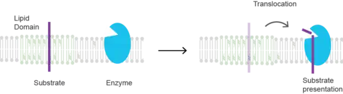 In molecular biology, substrate presentation is a biological process that activates a protein. The protein is sequestered away from its substrate and then activated by release and exposure to its substrate.[1][2] A substrate is typically the substance on which an enzyme acts but can also be a protein surface to which a ligand binds. In the case of an interaction with an enzyme, the protein or organic substrate typically changes chemical form. Substrate presentation differs from allosteric regulation in that the enzyme need not change its conformation to begin catalysis. Substrate presentation is best described for domain partitioning at nanoscopic distances (<100 nm).[3]